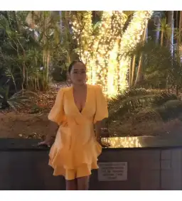 Fitted V-Neck cross over at bust. Tiered skirt with adjustable tie