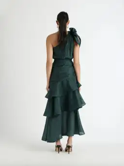 Stand out at your next event in striking green hues and larger than life bows. Introducing the Casablanca Dress, showcasing a fitted cut, ruffled layered skirt, gathering detail on bodice and detachable bow.