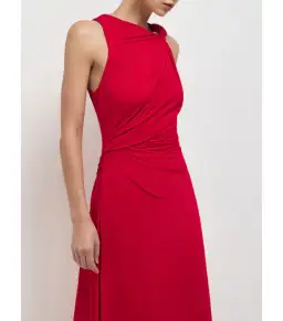 Flattering silhouettes and timeless design - introducing our Emporium Midi Dress, a wardrobe must have. Featuring a red stretch jersey fabrication, fit and flare styling, asymmetrical neckline with twist detail, ruching at bodice and skirt, asymmetrical hemline and midi skirt length. Style with our Elisa Earrings to complete the look.