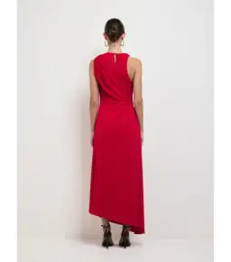 Flattering silhouettes and timeless design - introducing our Emporium Midi Dress, a wardrobe must have. Featuring a red stretch jersey fabrication, fit and flare styling, asymmetrical neckline with twist detail, ruching at bodice and skirt, asymmetrical hemline and midi skirt length. Style with our Elisa Earrings to complete the look.