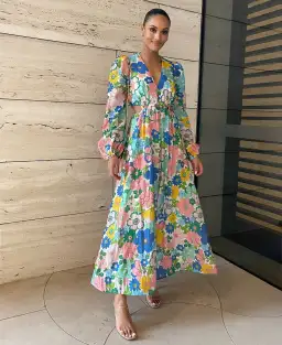 - This floral maxi comes in a coveted silhouette and showcases a fitted style with elasticated front waist cut outs and gold buckle detailing.