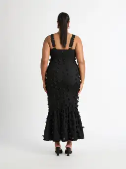 Intricate details and feminine silhouettes make up the Imani Dress. Showcasing a fitted cut, adjustable straps, cut out under bust and a mermaid maxi skirt with laser cut petal detailing throughout. Pair with our Goddess Earrings to complete the look.