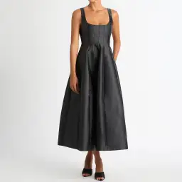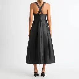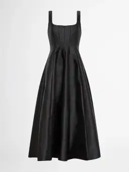 Black luxe mat satin fabrication midi dress features a fitted cut, rounded square neckline with adjustable straps and side seam insert pockets.