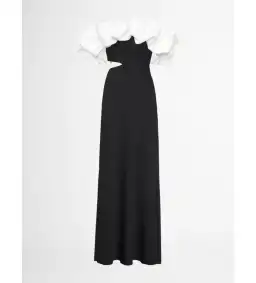 Featuring a fitted bodice with a contrast off shoulder neckline and side waist cut out, this beauteous maxi is a statement piece that will adorn your wardrobe for years to come.