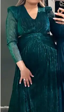 It features side cut outs, a figure hugging shape around the hips with a V neck and a relaxed skirt.