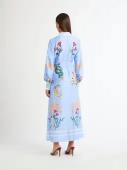 Showstopper! The Mystic Maxi Dress features a printed Tencel blend fabrication, relaxed styling, high neckline with stand collar and front button placket closer, long sleeves with cuffs, self fabric cord belt with gold toggle ends, side seam pockets and maxi skirt length.