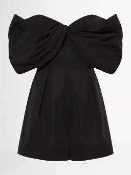 "Transport yourself to the fashion capital with our Parisian Playsuit! Showcasing a fitted cut, fixed waistband and oversized off shoulder bow sleeve. Pair with our Solar Earrings and Tina Heel to complete the look."