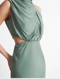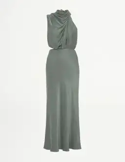 Luteous and much sought after - Our Park Ave Dress is back in a striking sage colourway. Showcasing a high cowl neck cut and a side waist cut out. Pair back with our Highlight Wedge and Anais Earrings to complete the look.