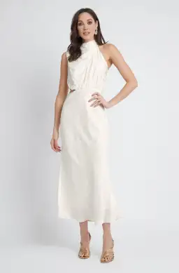 Fixed waist with side cut out detailing, is a midi length.