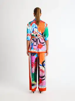 Our Rio Shirt features printed satin fabrication, relaxed styling, collar with front button closure and self fabric sash tie. Complete the look with our matching Rio Pant!