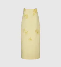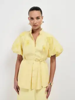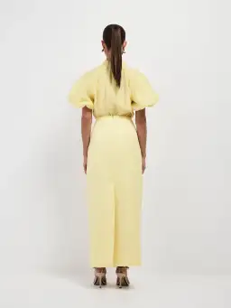 The Rose Garden skirt and top features a woven yellow fabrication with 3D flower detail. The skirt sits at true waist, maxi length and slim fit. The top features a stand collar neckline with concealed button opening, short bubble sleeves and self rouleau tie belt.