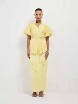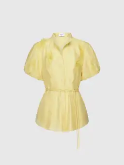 This head turning shirt features a woven yellow fabrication with 3D flower detail, stand collar neckline, concealed button opening, short bubble sleeves and self rouleau tie belt.