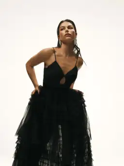 Showcasing a fitted bodice with centre cut out detailing, adjustable straps and a contrast velvet waist band, this luxuriant gown pays homage to traditional evening wear while capturing modernity and edge.