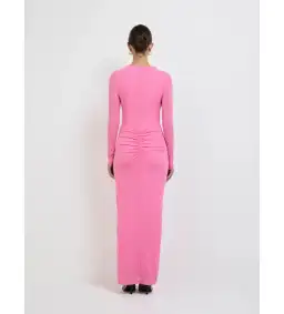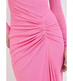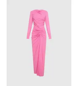Bright, bold, and beautifully draped. Introducing the Sophia Maxi Dress - Showcasing a pink stretch fabrication, fitted cut, high draped neckline, maxi length skirt, and gathering on front and back hip.
