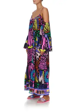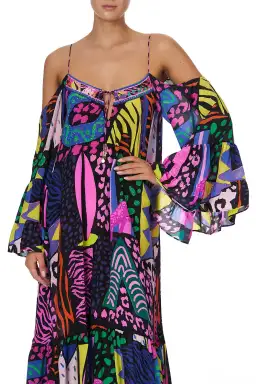A sea of purple, blue and yellow brings our Camilla namesake to life alongside pops of green and magenta. This romantic summer dress features a relaxed maxi silhouette, scintillating crystals and ruffles upon the arms that lead up to rouleau straps.