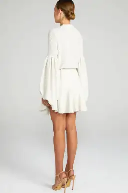 Balloon sleeve drawstring mini dress in a medium weight textured boucle knit. This dress features round neckline, midi length voluminous sleeves with elasticated cuff, drawstring waist and full mini skirt.