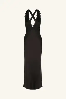 Plunged cross back midi dress with lace detail in a LENZING™ ECOVERO™ with luxurious satin finish.