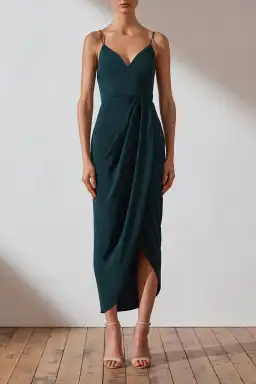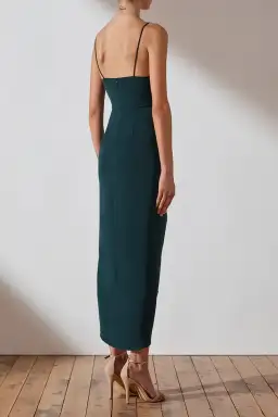 Cut from lightweight fabric in a regal green hue, the Shona Joy Core Cocktail Draped Maxi Dress wraps fluidly around the body. Shoestring straps and a high-cut split add a sultry touch.