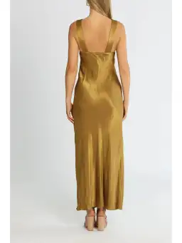 Achieve a stunning and distinctive look with the Giorgia Plunged Midi Dress in Olive Oil by Shona Joy. This cocktail dress, crafted in a silk-touch fabrication, features a sultry plunging neckline, sleeveless design, exaggerated empire waist, and a bias-cut midi-length skirt. Elevate your style for the next evening event by hiring this glamorous dress, complete with a plunging neckline and ruched bust detail, all in a luxurious satin fabric.
