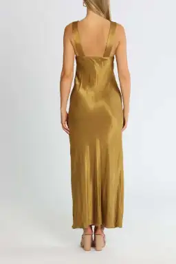 Get ready to shine with the Giorgia Plunged Midi Dress in Olive Oil by Shona Joy. This stunning cocktail dress is made from a silk touch fabric, featuring a sultry plunging neckline, sleeveless design, an empire waist that makes a statement, and a midi-length skirt cut on the bias. Rent this glamorous dress for your upcoming evening event.