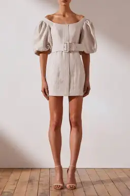 Fitted mini dress in a pure linen herringbone in a natural stone hue. This dress features off the shoulder neckline, decorative front tab, puff sleeve with elasticated cuff, invisible back zip and detachable belt.