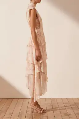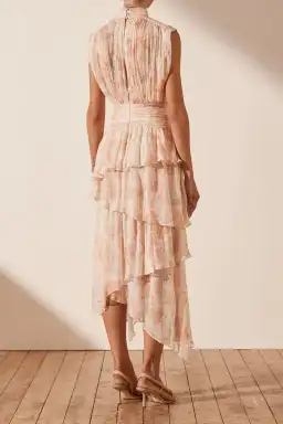 - Exclusive Faye print - Semi-sheer chiffon - High neckline with back button closure - Built in cami with adjustable rouleau straps - Invisible back zip - Gathered yoke waist - Midi length asymmetrical tiered skirt - Light weight, non-stretchy woven - 100% Viscose - Lined