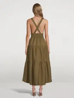 Crafted of a premium linen blend, this midi exudes a chic, summer-ready charm. It has a plunging neckline with an open back finished with ruched, criss-crossing straps. A tiered, calf-grazing skirt with side pockets completes the look. 55% Linen, 45% Viscose V-neck Adjustable spaghetti straps Concealed side zipper closure Imported