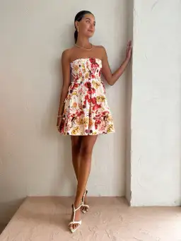 Turn heads in this exclusive Kalani print mini dress, featuring a flattering strapless shirred bodice, playful tiered frill skirt, and adjustable drawstring waist for the perfect fit. With side pockets for a touch of practicality, this medium-weight woven style is made for stylish, fuss-free moments.