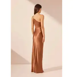 Ruched asymmetrical maxi dress in almond in a LENZING™ ECOVERO™ with luxurious satin finish.