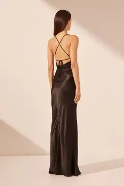 Elevate your look with this sleek and elegant maxi. Featuring a draped cowl neckline, adjustable lace-up back, and a floor-skimming silhouette, this dress is made for weddings, black-tie events and special occasions. The hidden zip ensures a seamless finish, while the lace-back detail adds a striking touch of glamour.