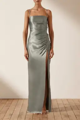 Sage - Maxi dress with ruched detailing at side split in a LENZING™ ECOVERO™ with luxurious satin finish.