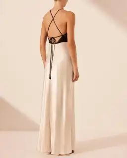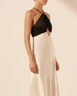 A striking halter-neck maxi dress crafted in a rich cream LENZING™ ECOVERO™ fabric, elevated with a refined satin finish. Designed with intention, this piece brings elegance and edge with an open back, gathered bust, and centre-front cut-out.