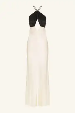 Cross back halter maxi dress in cream in a LENZING™ ECOVERO™ with a luxurious satin finish.
