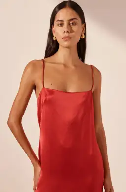 Dropped waist maxi dress in chilli in a luxurious satin acetate contrasted with a light weight semi-sheer georgette. Luxurious satin acetate contrasted with a semi-sheer viscose georgette Square neckline Rouleau straps Dropped waistline Contrast sheer fabric in skirt Loose fitting Invisible zip at centre back Maxi length sheer skirt Medium weight, non-stretchy woven