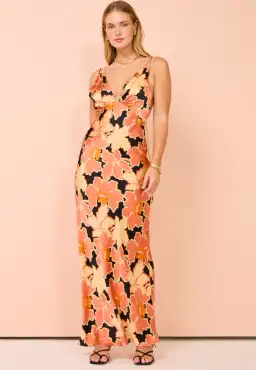 Shona Joy Rosa Silk Plunged Double Strap Maxi Dress in Coral Pink/Multi Size 8