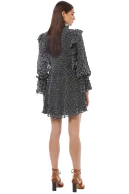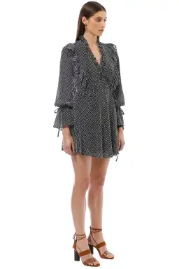 This spotted chiffon mini dress is flouncy and flirtatious. Lightweight and semi-sheer, it’s guaranteed to be a new summer wardrobe staple! Features a V neckline with ruffle detail and a crossover front. It's the perfect textured mini dress to hire for your next cocktail party!