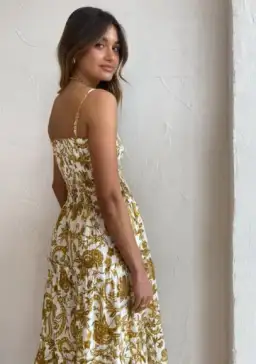 The charming floral print and feminine silhouette of the Saffron Shirred Tiered Midi Dres sin Curry/Ivory by Shona Joy has awoken our inner romantic for sun-drenched summers days and cocktails at twilight.