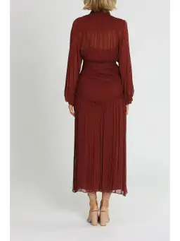Embrace bold style with the Safira Button Up Ruched Midi Dress from Shona Joy, ideal for your upcoming daytime events. This dress highlights a luxe gold front button closure, semi-sheer long sleeves, and a midi-length design. To make it yours, consider renting it for an upcoming luncheon. The dress also features an invisible side zip, a side leg split, and layered pleat detailing on the skirt for added flair.