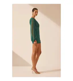 - Semi-sheer chiffon- Asymmetrical neckline- Singular balloon sleeve with elasticated cuffs- Fitted ruching throughout- Invisible side zip- Cut out detail on side- Mini length