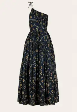 "One shoulder tiered maxi dress in the exclusive Vacance print in a light weight GOTS certified organic cotton voile.