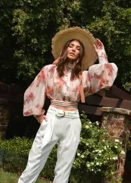 An adored Mackenzie Mode silhouette, the Shooting Stars Blouse is divinely luxe. Crafted in a delicate print lost in dusty pink hues and hand-painted flowers, it features an alluring button up front, invisible back zip, elasticised cuffs and hem.
