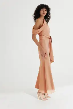 Crafted from our soft touch fabrication, the Amal Dress in Caramel is a great option for bridesmaids this season. Designed to be fitted at the bust and relaxed toward the hem, this style features an asymmetrical off shoulder design and removable waist sash.