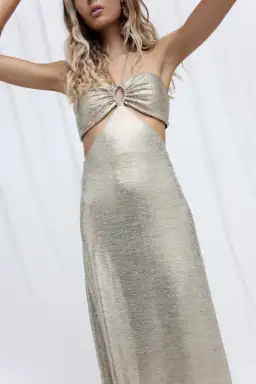 Comfortable maxi dress that can be dressed up or down. Shiny gold stretchy material.