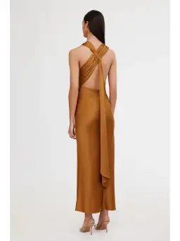 Bridesmaid silhouettes have seen an update this season ~ the Annabel Dress in Gold is crafted from our soft touch satin fabrication. Featuring a high neckline, soft gathers through the bodice and open back feature with adjustable sash detail.