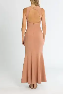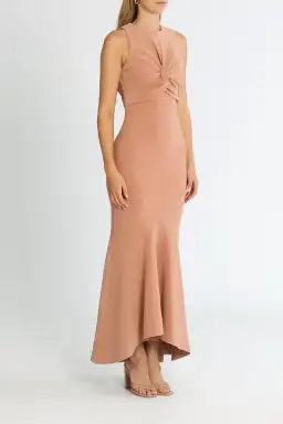 For a stylish yet effortless look, consider the Ezra Dress in Almond by Significant Other. With a flattering fit and flare silhouette, it boasts a twisted detail at the front and a cutout back, gracefully ending in a fishtail hem. Ideal for bridesmaids, this midi-length dress with an invisible center back zip and ruffled hem offers a chic and easygoing option for any event.