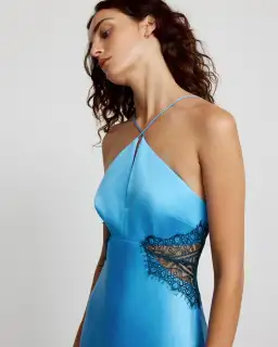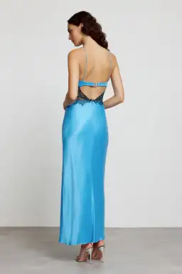 A fresh take on the classic midi dress silhouette ~ crafted from a soft touch satin, the Helaina Midi Dress in Azure Blue features a halter neckline, subtle front bodice cut out, scooped backline and luxurious gold hardware.