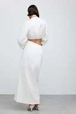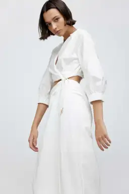 A dreamy piece perfect to take on your next vacay, the Kara Midi Dress in Ivory features 3/4 sleeves, side seam cut out, elasticated cuffs and collared neckline. Crafted from a crisp cotton ~ this piece is perfect for layering on cooler nights. Pair with a simple slide for a complete look.