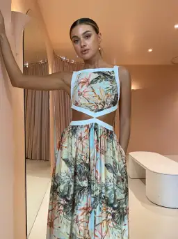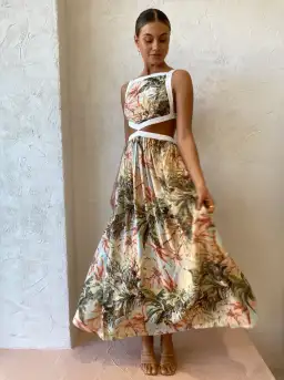 Contrasted with ivory binding to accentuate the floral fabric and waist cut outs, this maxi will make a statement at your next ladies lunch, birthday or wedding celebration.