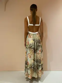 Crafted from an airy linen-blend with painterly tropical florals, this maxi dress features a high straight neckline and waist cutouts which lead to an exposed strappy back before falling into a fluid maxi silhouette.