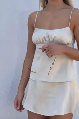 90's inspired mini skirt with a wave hem detail, made in soft, sueded 100% silk and cami with ruched top detailing and adjustable straps.